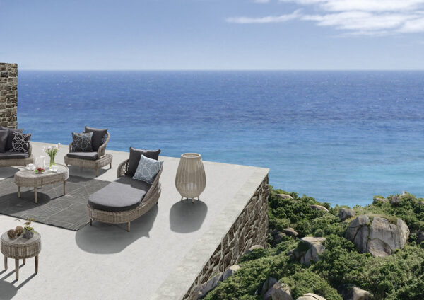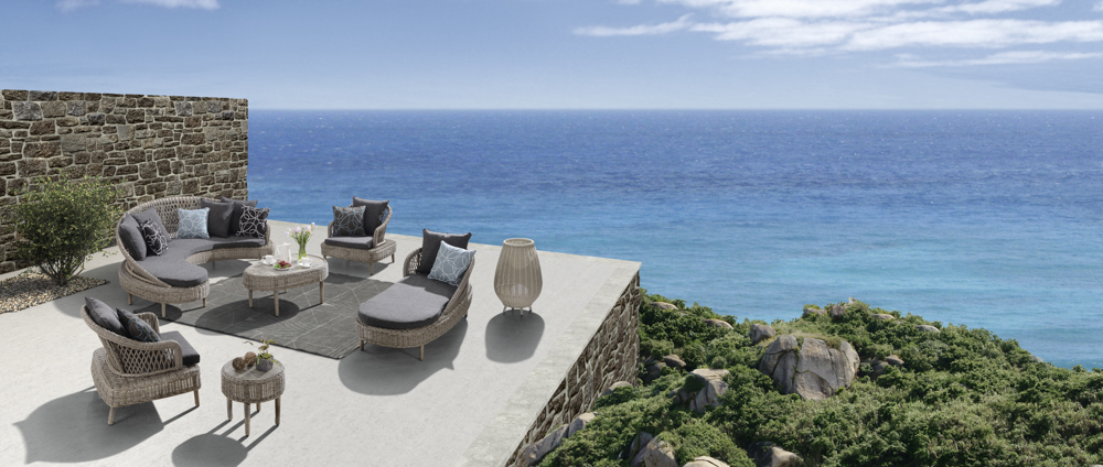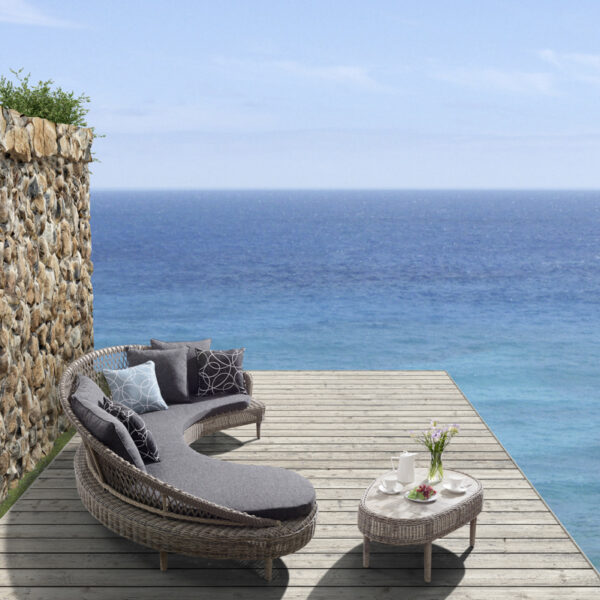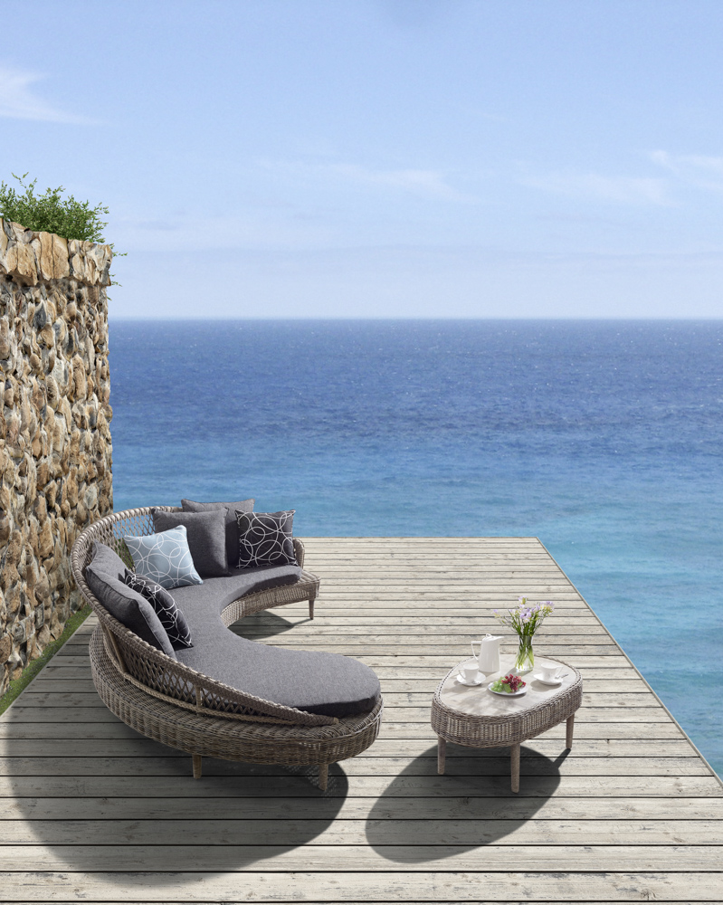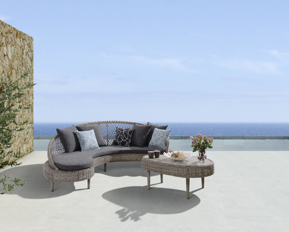 - Aluminum + PE rattan + fabric, cushions and pillows made with Sunproof fabric and high-density foam, pillows filled with doll cotton.