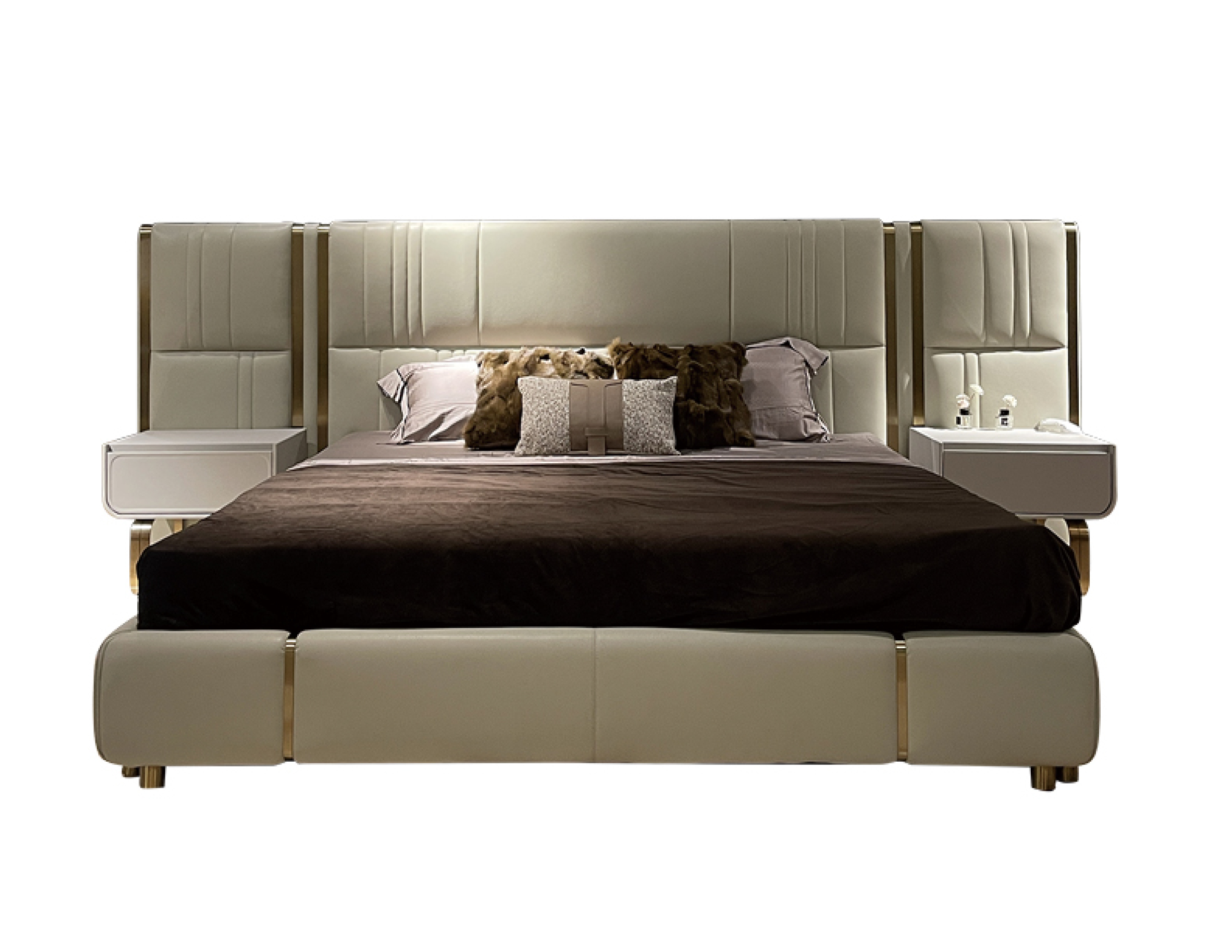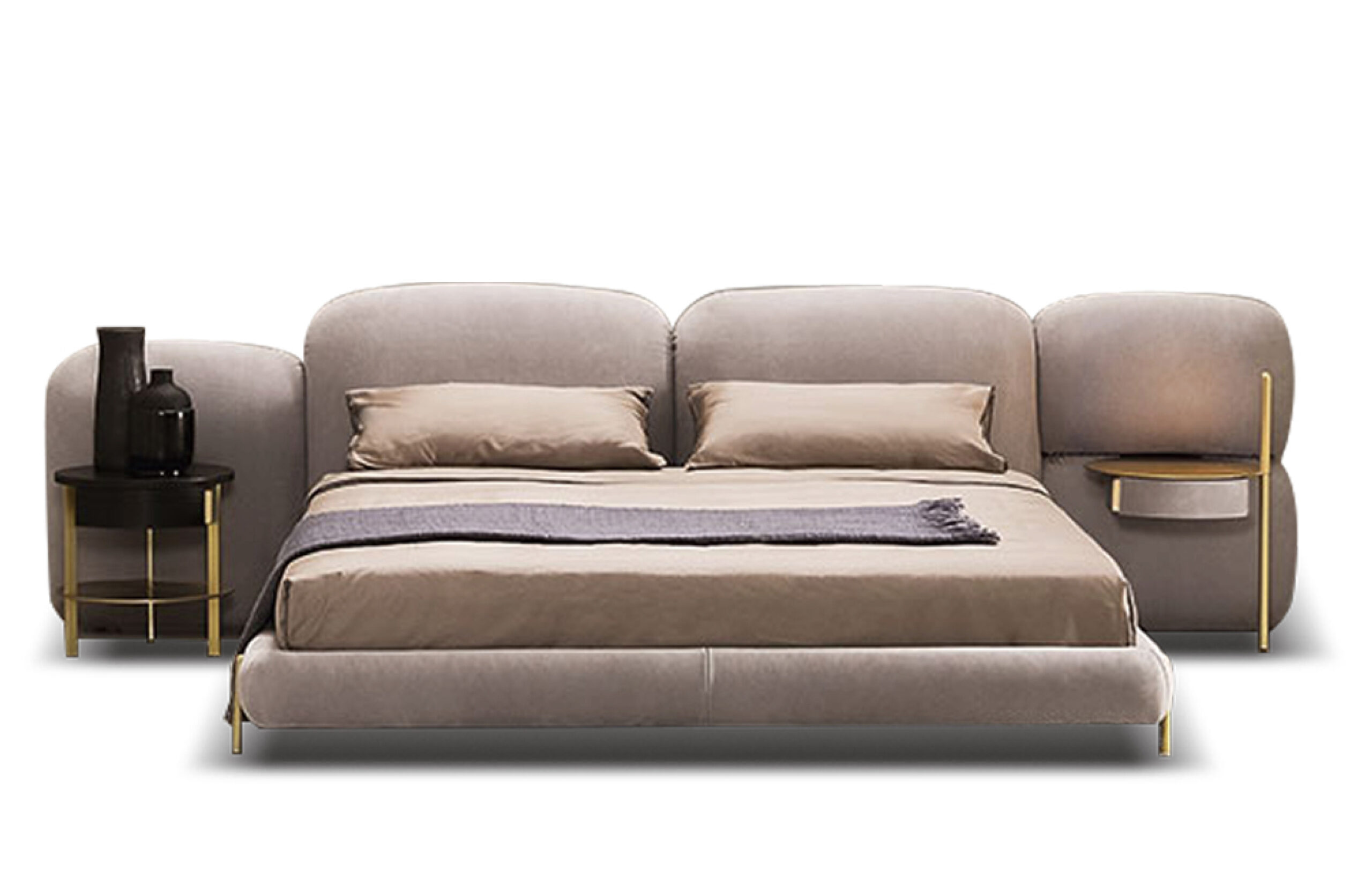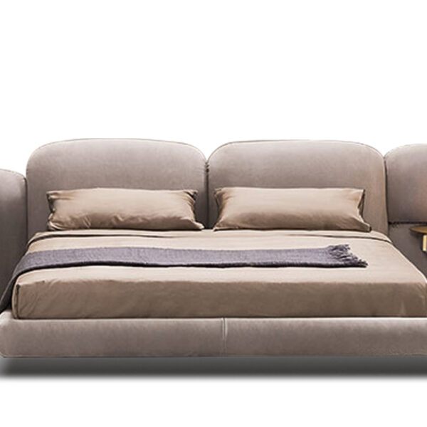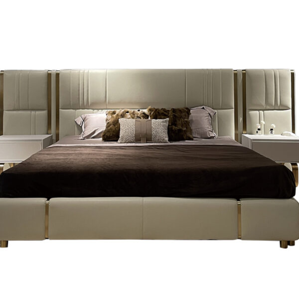Chất liệu: Khung giường gỗ tự nhiên nhiều lớp bọc vải lưới xám Palpon + thép không gỉ màu đen vàng xước